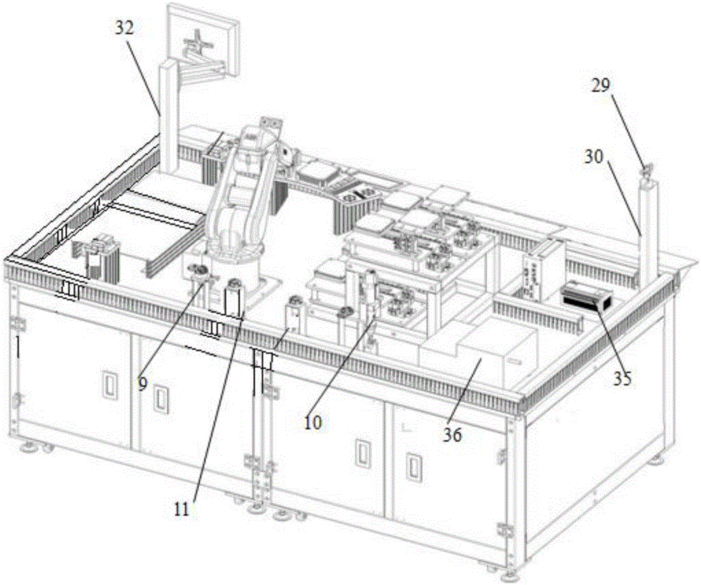 綜合實(shí)訓(xùn)臺上合理分布有模擬上下料組件和模擬碼垛組件,用來模擬真實(shí)工廠流水線加工作業(yè)過程,通過工業(yè)機(jī)器人的配合確保生產(chǎn)線正常運(yùn)行,組件